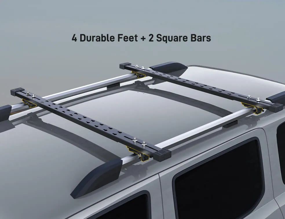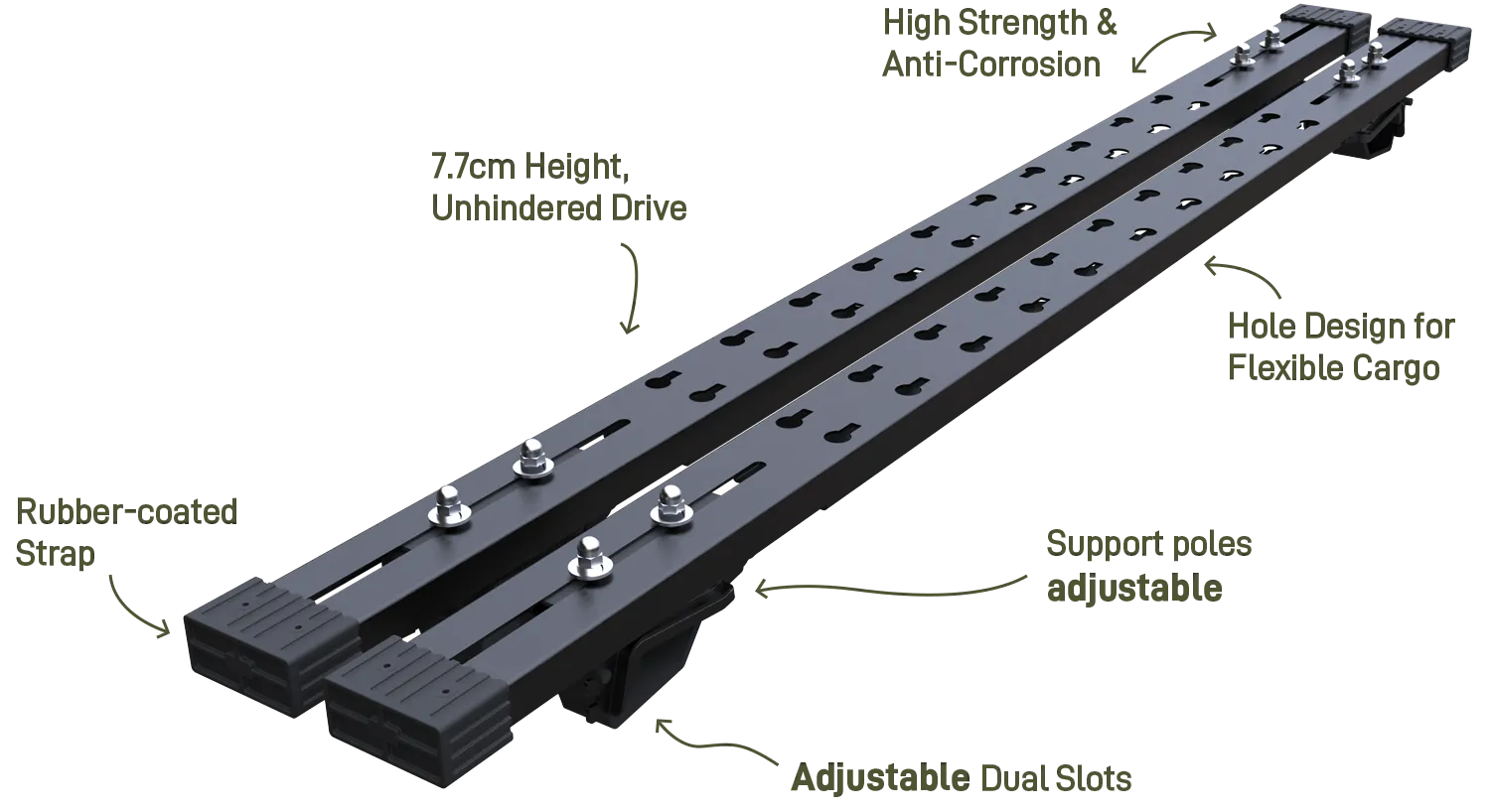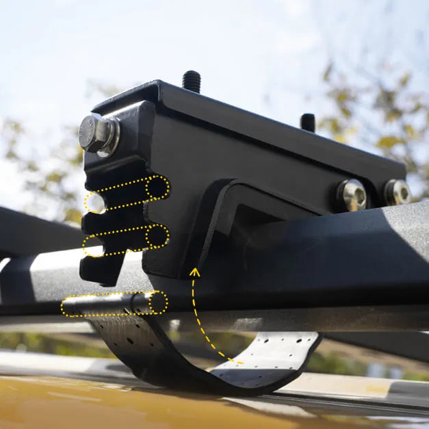 High Strength, strong load-bearing capacity, and corrosion-resistant.Patented practical and versatile design provides additional grip for rooftop cargo.Two optional slots, adjustable as per the thickness of the bars.Strict height control makes unhindered access.Aerodynamic design to reduce wind noise.